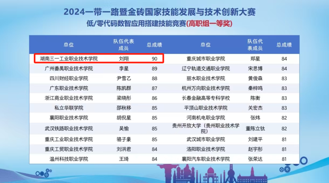 近日,2024一带一路暨金砖国家技能发展与技术创新大赛全国总决赛圆满闭幕。我校由徐金明、吴建伟老师指导的高职团队(团队成员:李滨、刘翔、彭波)荣获低/零代码数智应用搭建技能竞赛全国总决赛一等奖(第一名),由尹维汉、陈晓柳指导的高职团队(团队成员:谭亮、刘翔)荣获“智改数转”现场工程师集成与操作运维竞赛全国总决赛二等奖,同时尹维汉、陈晓柳老师获电子设计、制造与智能控制的综合应用赛项教师组全国二等奖,学校荣获优秀组织奖。