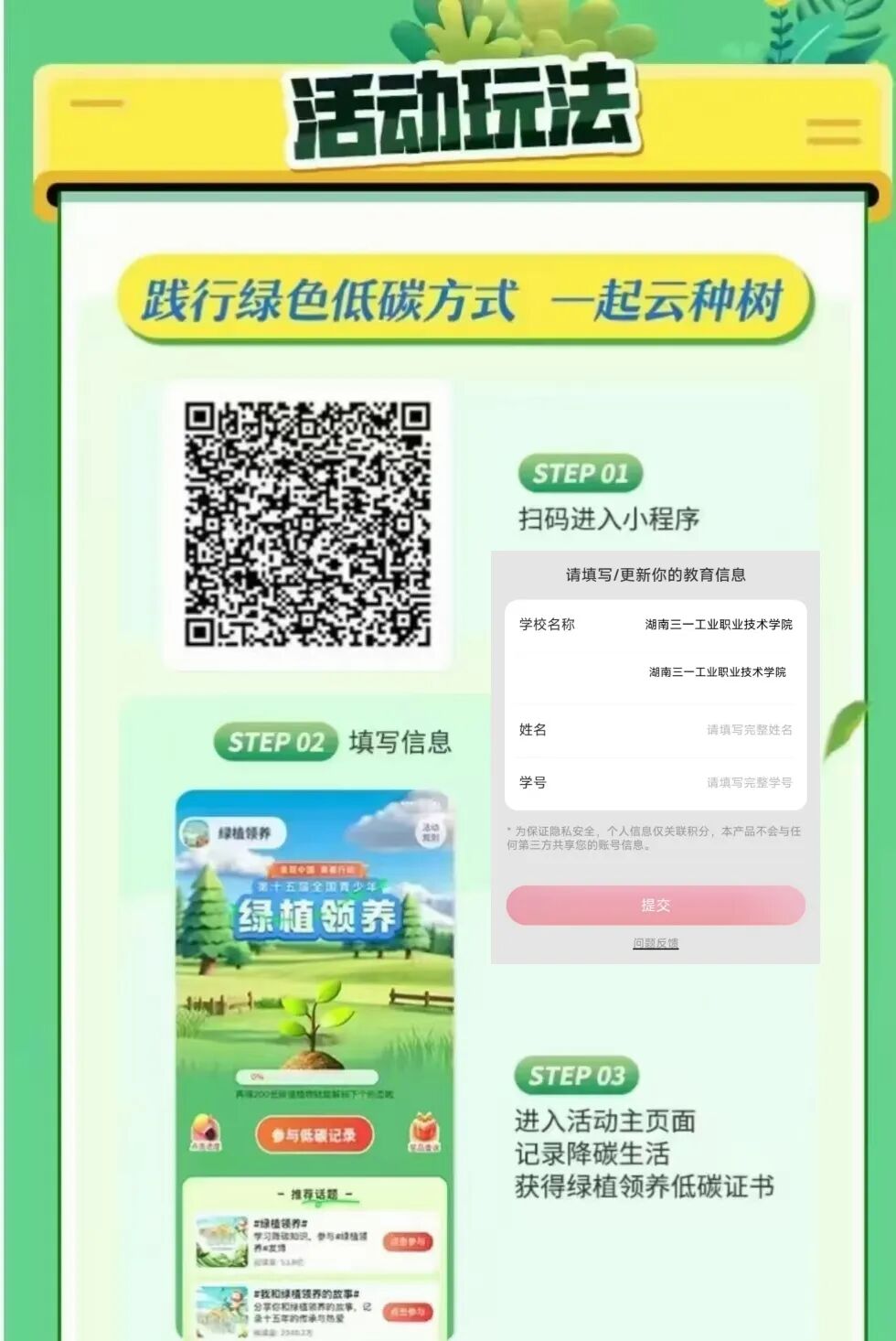 当水土流失侵蚀着每一寸土,当生态平衡成为时代重任,热血的我们怎样回应?2025全国青少年绿植领养活动盛大开启!用一棵树苗的生机,为大地添一抹新绿。用无数青春的爱,筑就美丽中国的绿色长城。 一 环境益处 二 生态平衡 三 社会效益 “美丽校园,青春行动”2025全国青少年绿植领养活动在抖音、微博正式启动!动动手指,就有机会为校园免费赢取绿植,为校园添生机与美丽。快叫上小伙伴一起参与! 在活动现场扫描绿植领养二维码,参加微博绿植打卡活动。完成打卡即可进行抽奖,更多绿植等你带回家! 第一步:参与人员需使用新浪微博APP,扫描三一职院专属二维码; 第二步:进入活动主页,完善教育信息。(学校类型选择:高职;学校选择:湖南三一工业职业技术学院) 第三步:点击去种树参与活动,关注本校超话和官微 第四步:点击参与低碳记录做任务,即可抽奖领取奖品 一等奖:黑色小提灯 二等奖:易拉罐盆栽 三等奖:多肉 四等奖:挂件 笔 五等奖:本子 书签 扇子 便利贴 明信片 1、先将黑色营养土倒在花盆里,倒9分满,稍微压压平,不要太紧 ,捣个洞。 2、把肉肉的根埋进去,根部稍微压压紧,最后铺一层铺面土就可以了。 3、种植后多晒太阳,但夏天要记得适当遮阴。 4、春秋季一周浇一次水,夏季3~5浇一次,冬季可以一个月浇一次。 在这春意盎然 满怀希望的时节 领养一棵专属绿植 将大自然的绿色传递 把绿色理念转化为长期的行动 排版 | 肖璟 美工 | 周天语