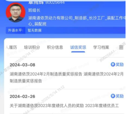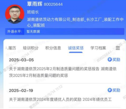 翻开覃雨辉的工作档案,满满的荣誉记录着他的奋斗足迹。在 2023 - 2025 年间,他多次因妥善处理制造质量问题、带领班组取得突出成绩,以及在宝马展机制作、发电机组现场改善等重要项目中的出色表现获得嘉奖。2024 年,他被评为绩优员工;2025 年,又因在质量问题处理等工作中的卓越贡献再次受到表彰。这些荣誉,不仅是对他个人能力的肯定,更是他用实干精神书写价值的有力见证。
