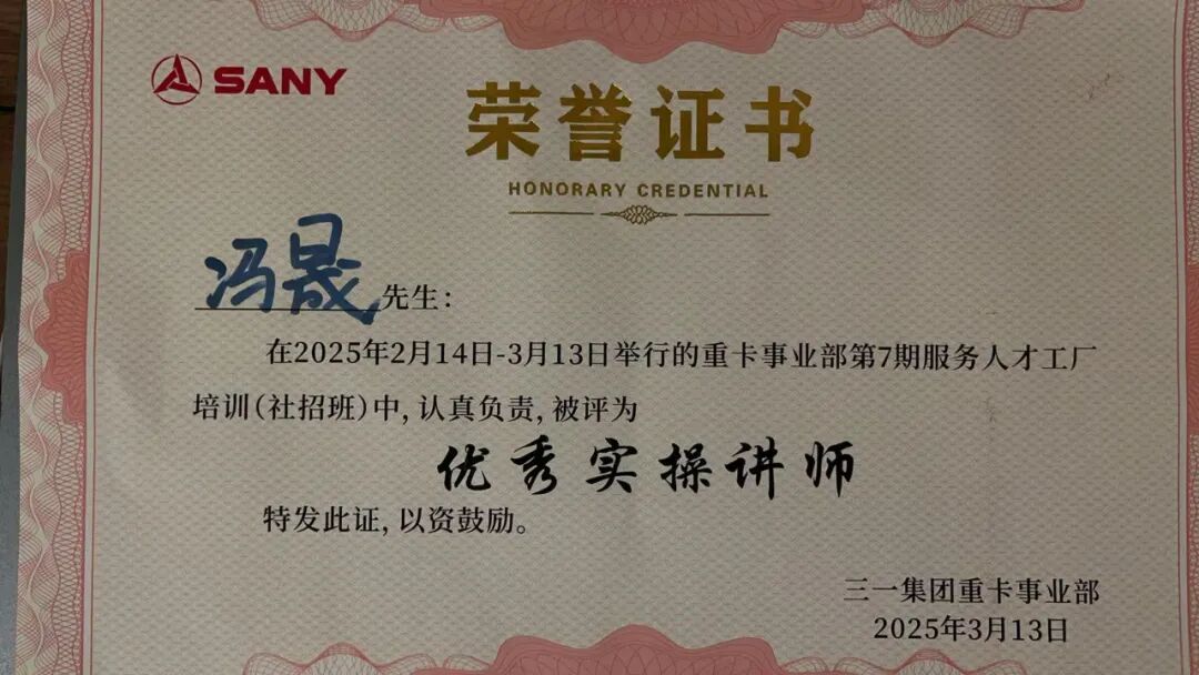 在工作之余,冯晟更是将自己的全部精力都投入到了新能源工程机械行业的学习之中。他不断汲取新能源领域的前沿知识和技术,将所学所得转化为宝贵的培训资源,用实际行动践行着“授人以渔”的教育理念。从攻克CAN报文采集难题到掌握多模块集成维修技术,冯晟将复杂的代码转化为易于传承的经验图谱,并积极参与新疆、印尼等地区的服务工程师培训工作,累计培训人数超过200人。在2025春季举行的重卡事业部第七期服务人才工厂培训班中,冯晟更是被评为优秀实操讲师,展现了他在培训领域的卓越才能。