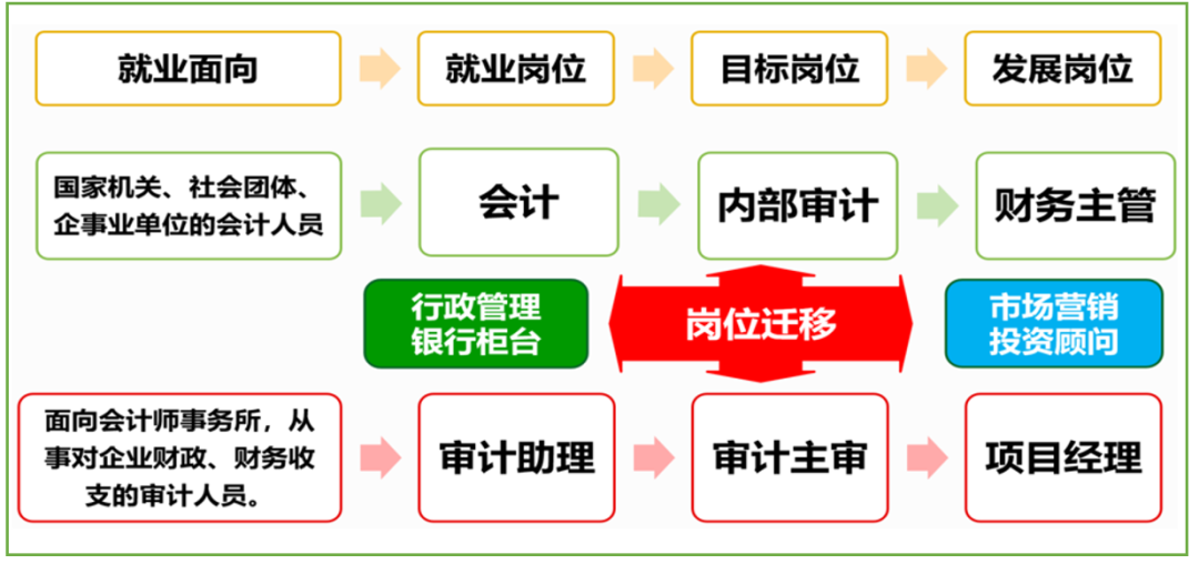本专业就业前景良好,具有广阔的职业发展空间。学生毕业后可在各类中小企业、会计师事务所、金融机构、事业单位从事出纳、会计、税务、审计等工作。近三年,毕业生就业率始终保持在92%以上,薪资待遇超过社会平均薪酬水平18%,经过5-8年学习和工作后,我们将有机会从事总账会计、审计经理等岗位,个人薪酬也将随着工作岗位的变迁而稳定提升,可以达到10万以上。